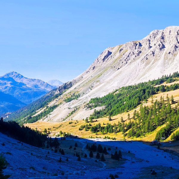 La randonnée du Mont Chaberton (3131 m) avec son chien débute à Montgenèvre, en suivant une large piste carrossable qui s’élève progressivement à travers les mélèzes. Cette première partie est idéale pour s’échauffer en douceur, autant pour le randonneur que pour le chien, avec une pente régulière et un terrain confortable.