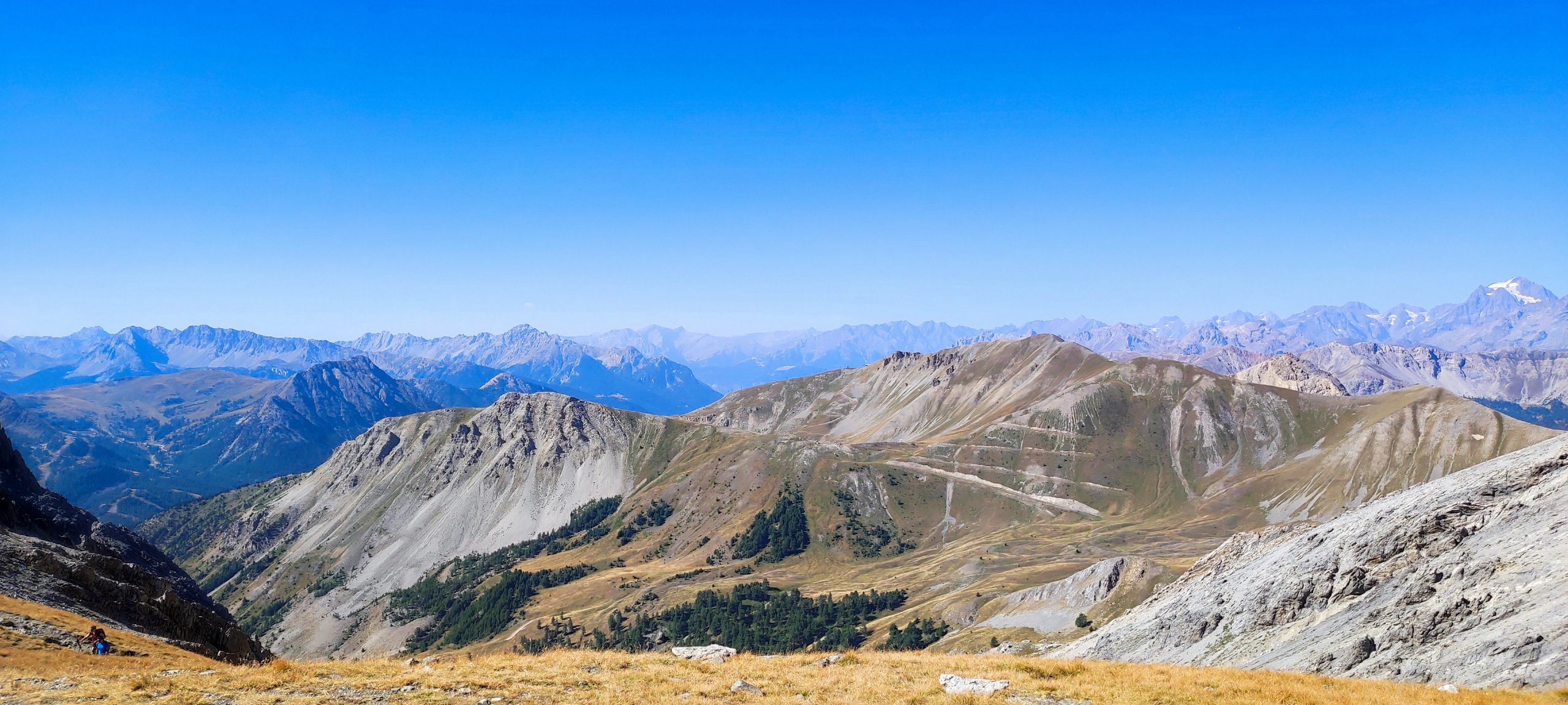 La montée se poursuit jusqu’au col du Chaberton, aux alentours de 2690 m, un point clé de l’itinéraire. C’est un excellent endroit pour faire une pause, reprendre des forces et profiter du panorama avant la dernière ascension. À partir de là, le décor devient plus austère et caillouteux, avec une ambiance de haute montagne bien marquée.