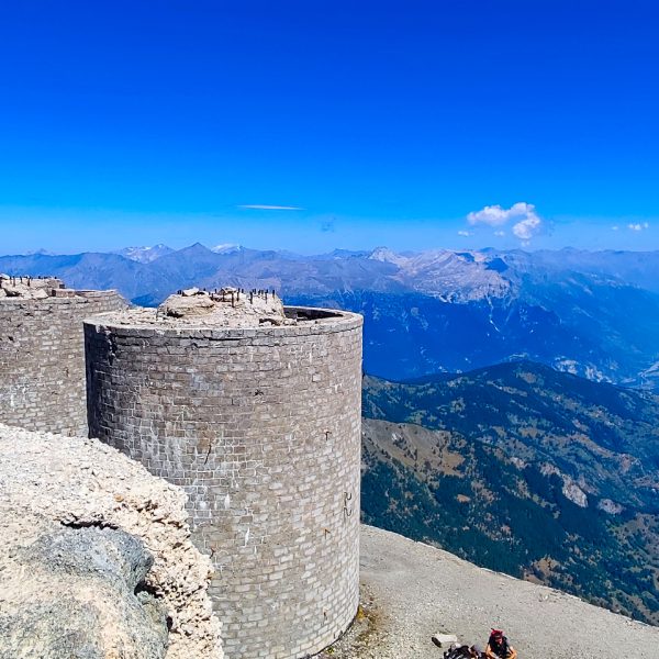 La dernière montée vers le sommet est la plus soutenue, mais reste non aérienne et parfaitement praticable pour un chien sportif et habitué à la montagne. On atteint finalement le sommet du Mont Chaberton à 3131 m, dominé par les impressionnantes ruines du fort militaire. La vue y est spectaculaire, avec un panorama à 360° sur les Alpes françaises et italiennes, récompensant largement l’effort fourni.